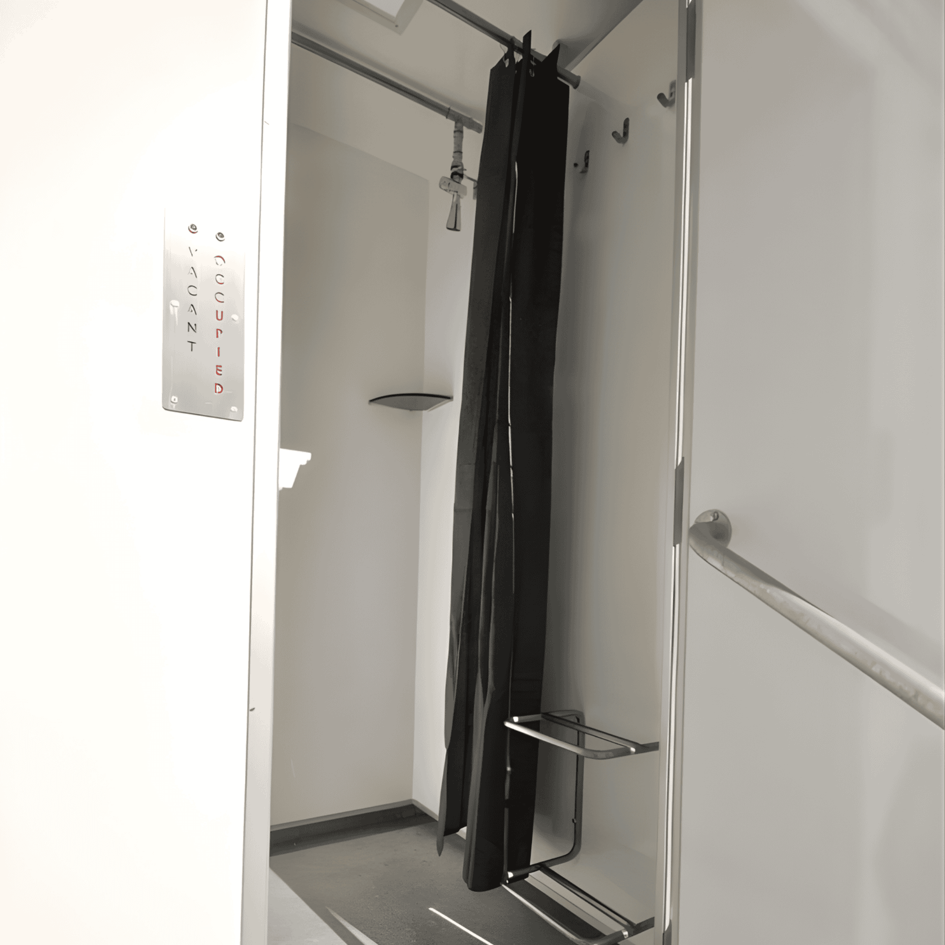 2 vaskerender med 3 vandhaner, spejl med LED lys, sæbebeholder, 2 stk. el-stik 230V, LED lys langs begge sider af vognen, indikator for optaget, rød og grøn LED.