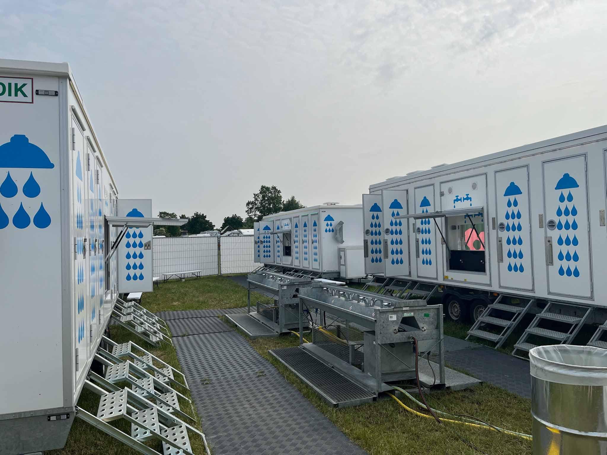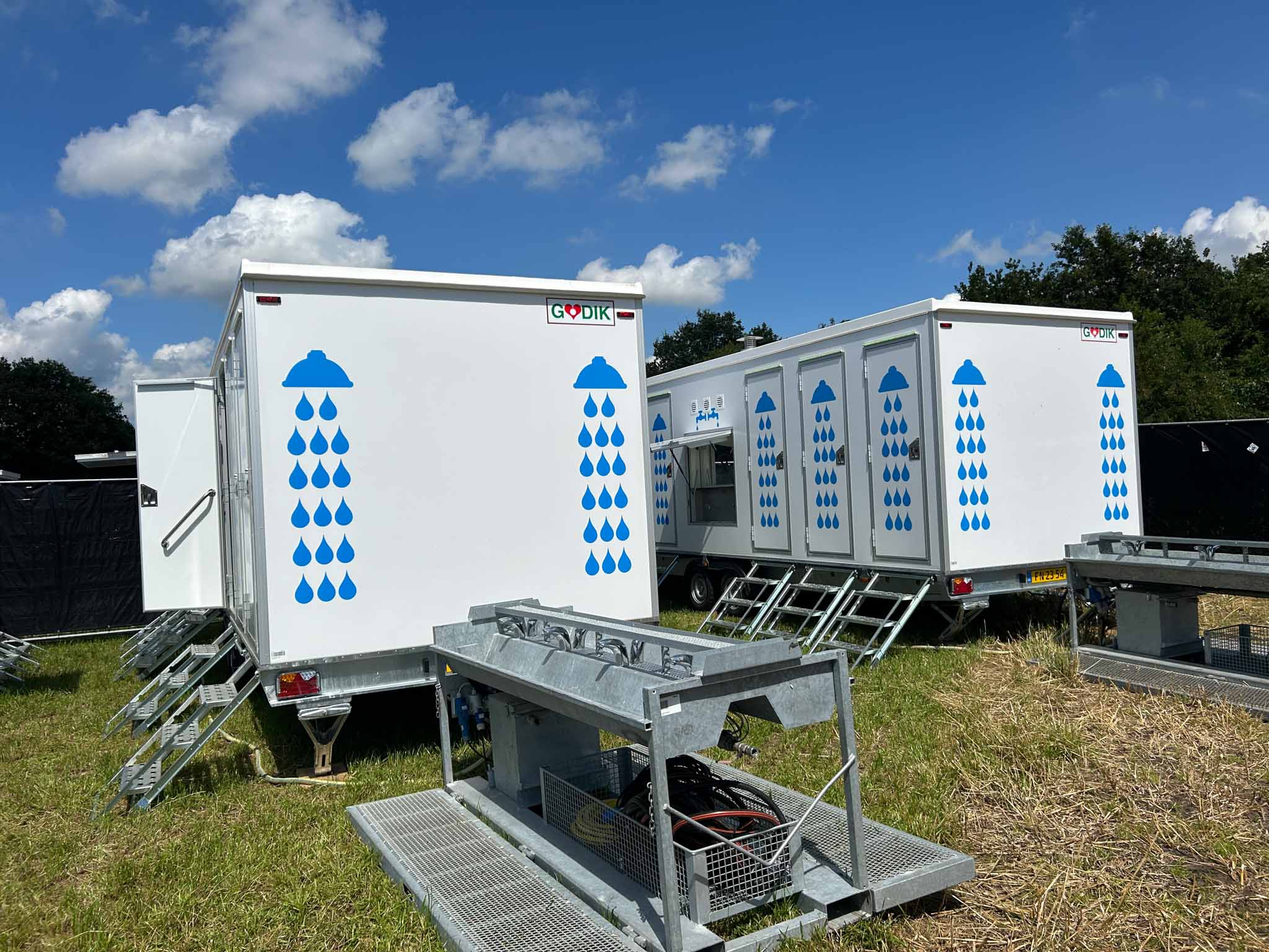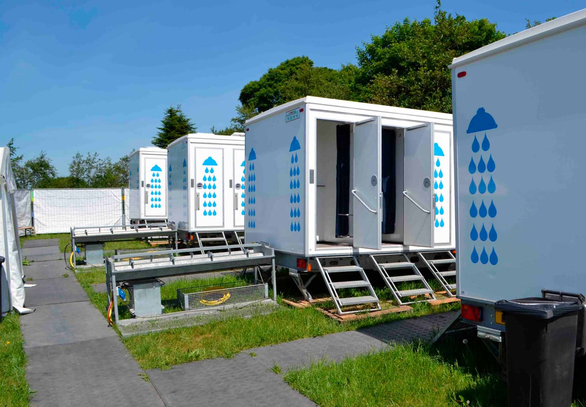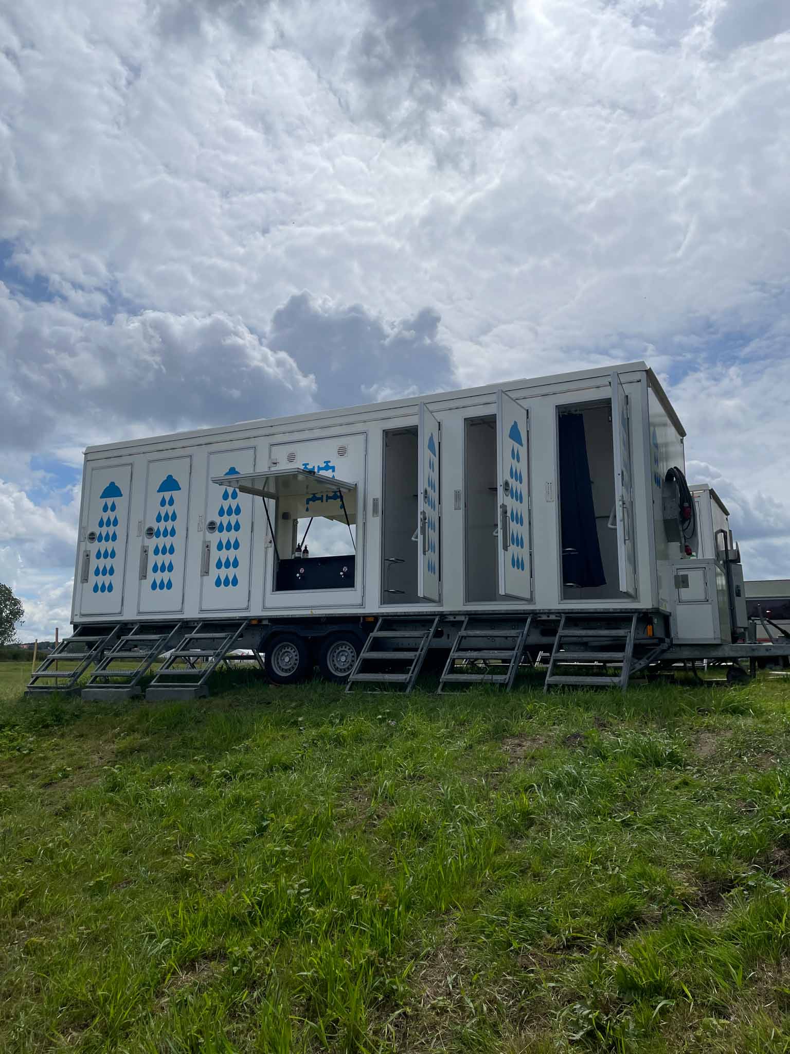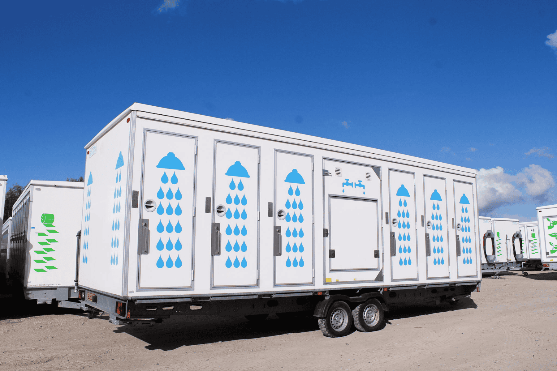 Stor badevogn med 12 brusere og fire håndvaske – perfekt til festivaler og større arrangementer. Kombinationen af høj kapacitet og god hygiejne sikrer en behagelig oplevelse for brugerne.