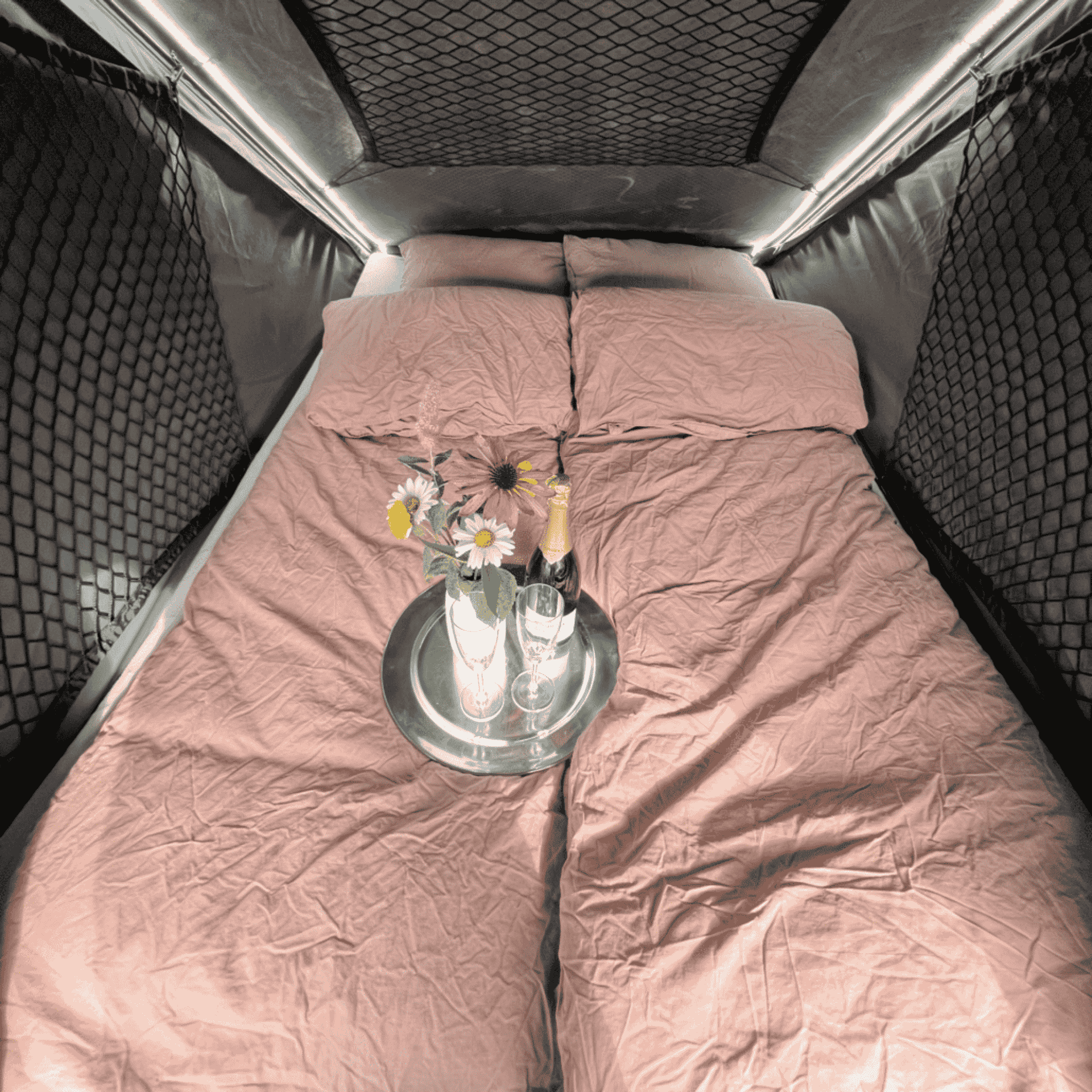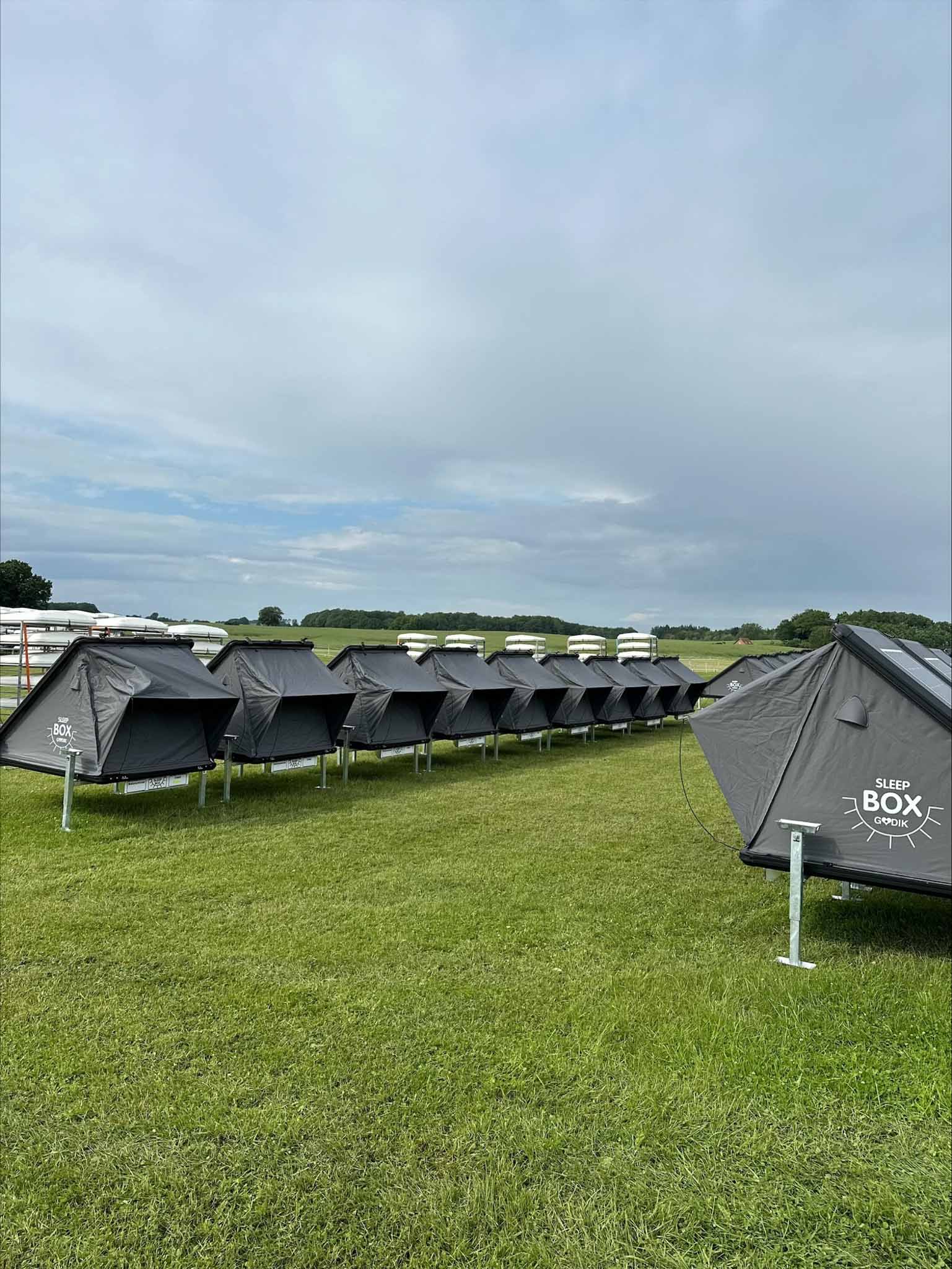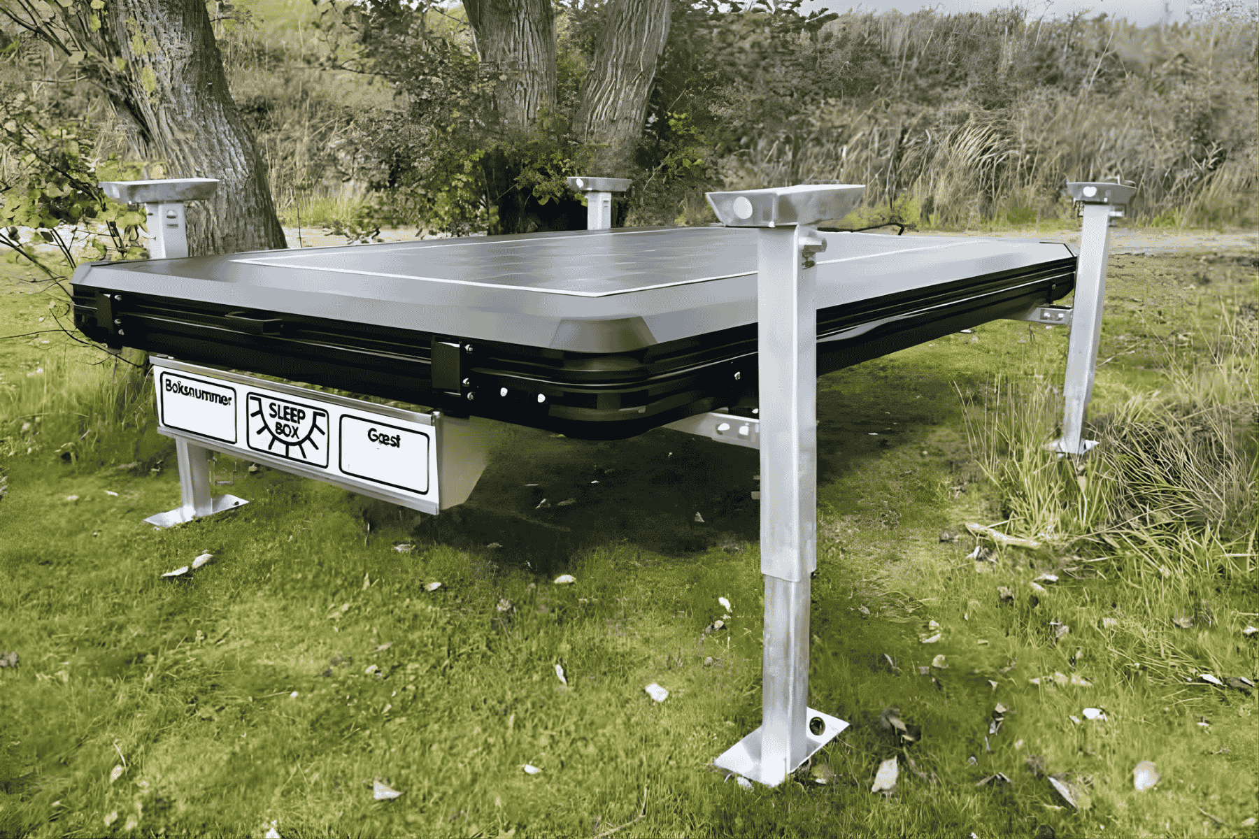 Inklusiv en skummadras til 2 personer, bagagenet, LED-lys og lockbox. Solceller på taget driver en powerbox med 12V USB-udtag, og det justerbare stativ sikrer plan liggeflade og nem stabeltransport. Perfekt til festivaler og events.