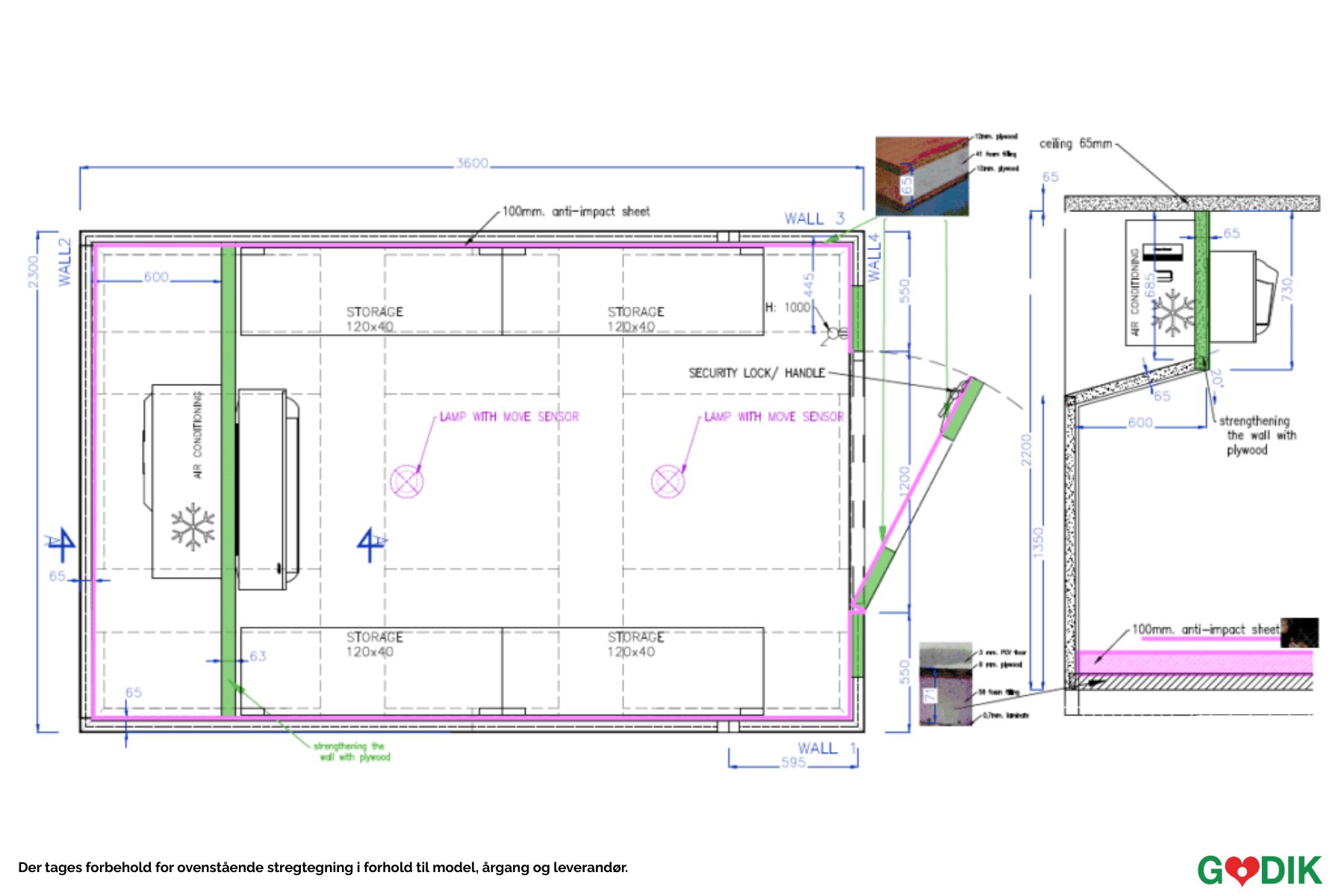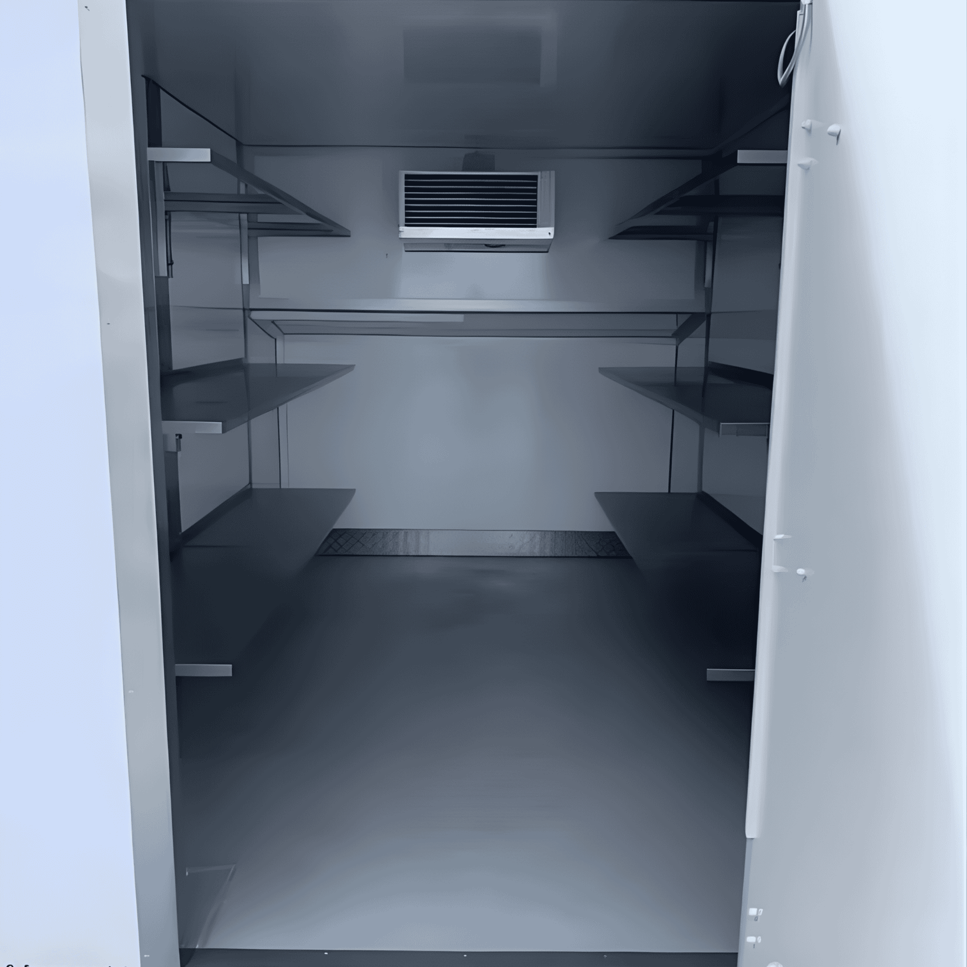 2 lys med bevægelses sensor, 16 stk. 40x120 cm hylder i rustfrit stål på sidevægge, ydervægge med rustfri fodliste, dør (200x120 cm) med håndtag på begge sider, indbygget kølemaskine, forstærkede hjørner på modulet, gaffel lommer for truck.