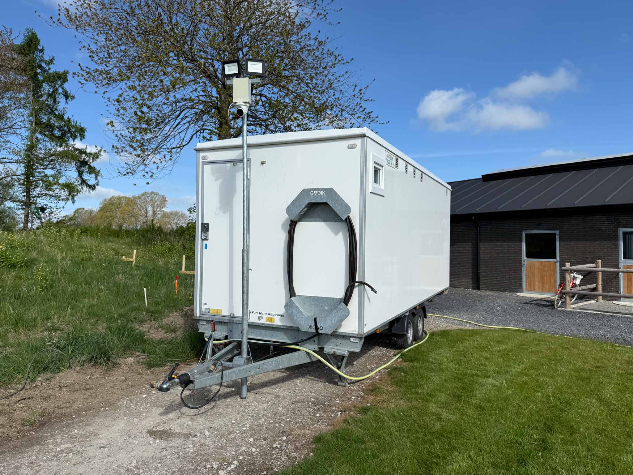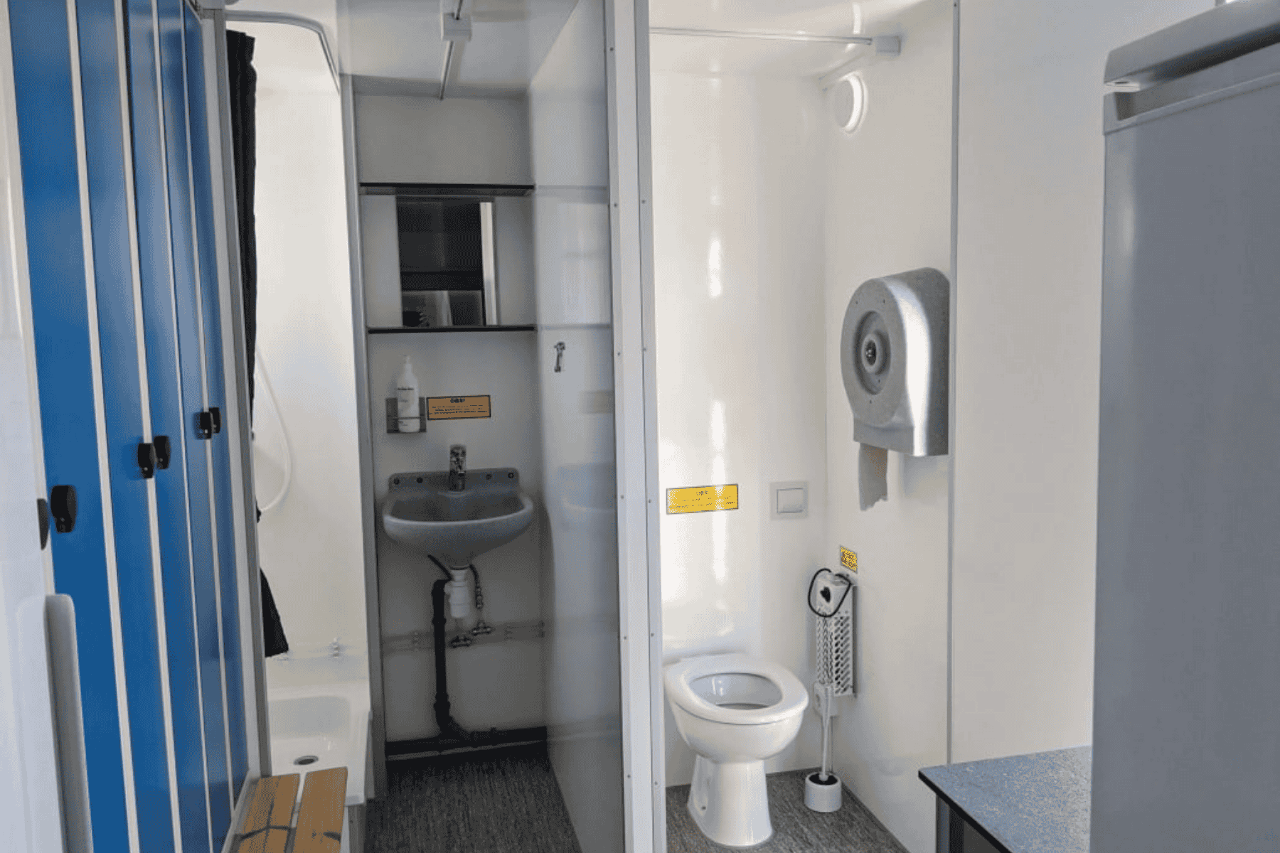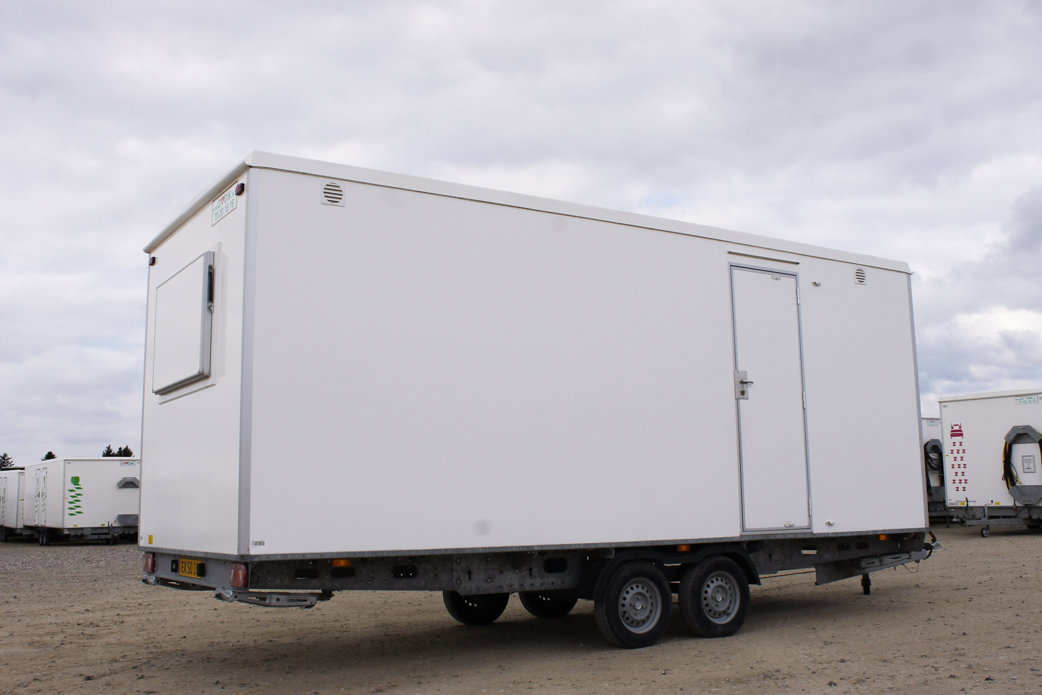 Mandskabsvogn med seks pladser, opholdsrum og køkkenfaciliteter. Praktisk løsning til byggepladser.