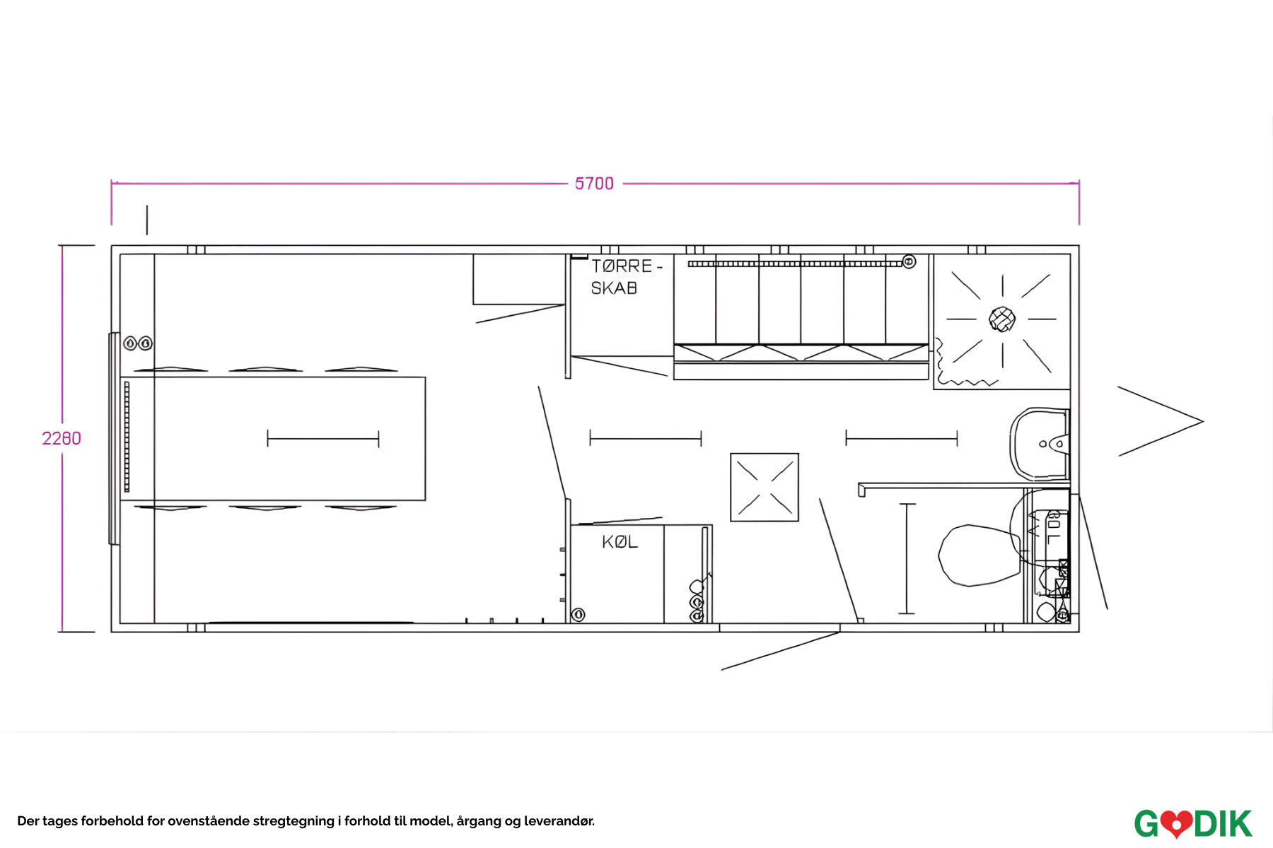 Mandskabsvogn med opholdsrum, køkken og toilet med kværn. Indeholder køleskab, kaffemaskine og tørreskab