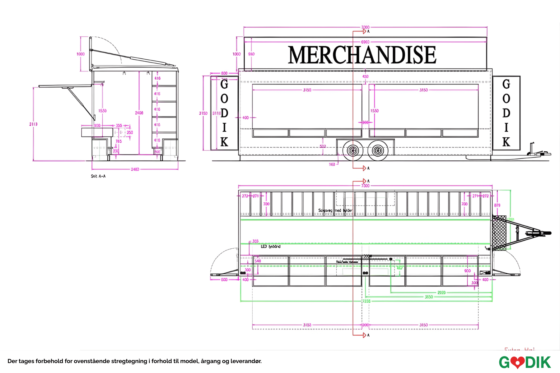 1 stk. topskilt. Foliemål: 96x696 cm. 2 stk. sideskilte. Foliemål: 76x211 cm.