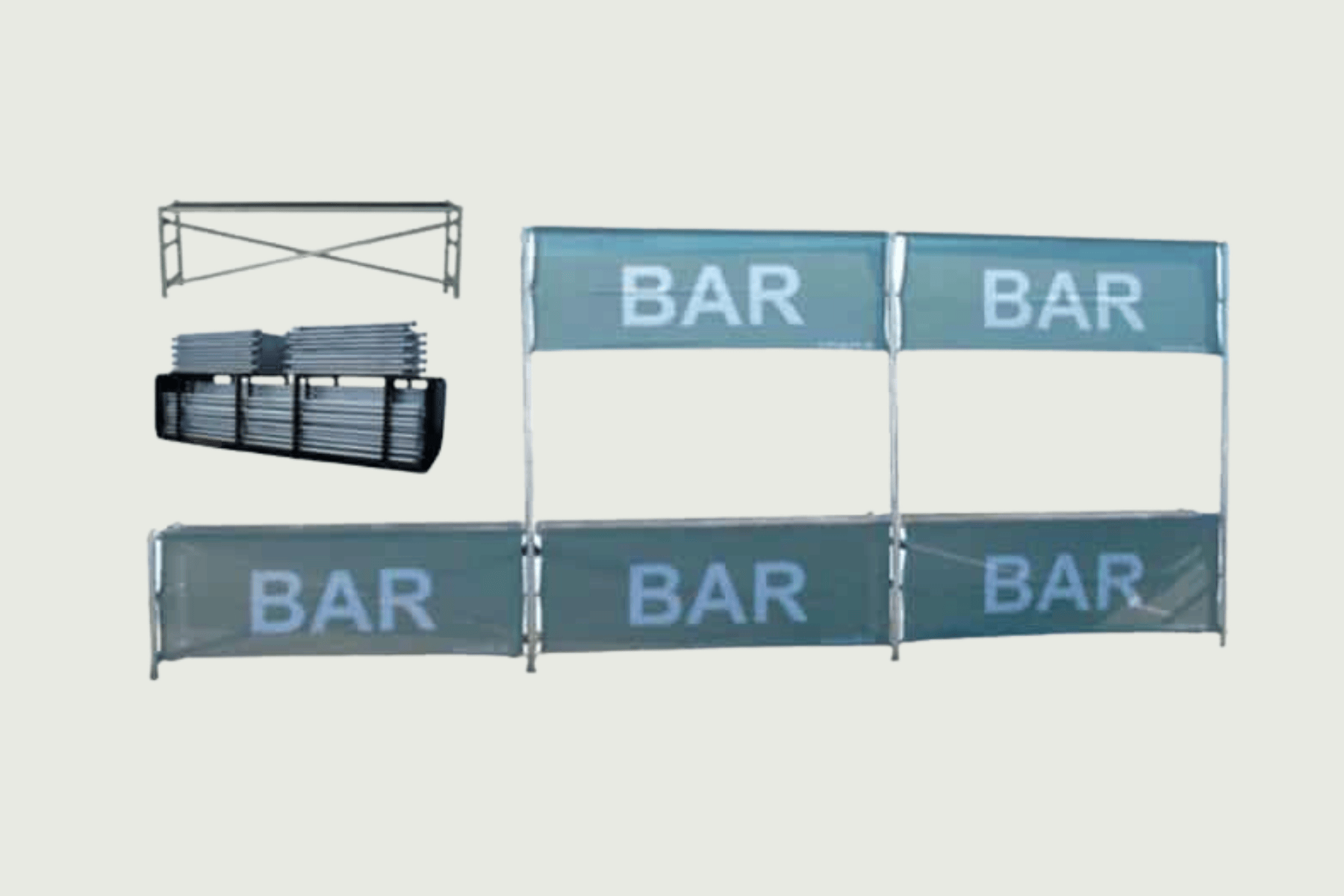 Komplet sæt med 10 modulbaserede stilladsbarer – et fleksibelt barsystem bygget af professionelle stilladskomponenter. Velegnet til opbygning af robuste barer og salgsområder på festivaler og events. Kan udbygges med hjørner, bannersøjler og fronter.