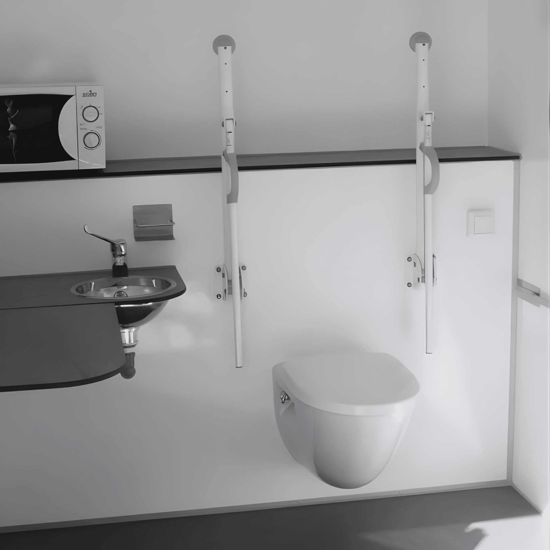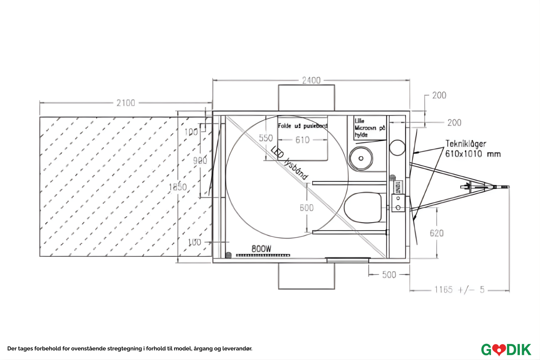 LED lamper udv. og indv., radiator, dispenser holder, håndvask, spejl, knager, mikroovn.