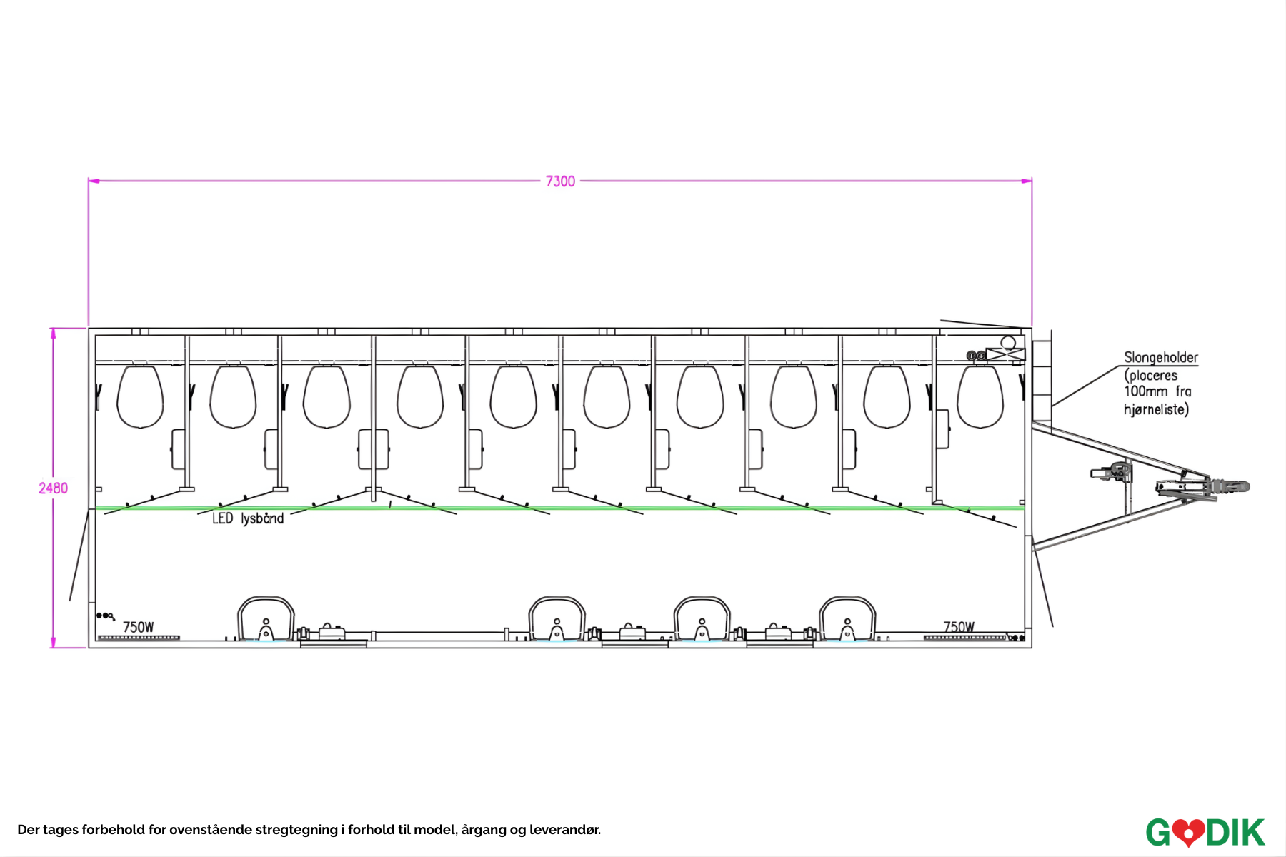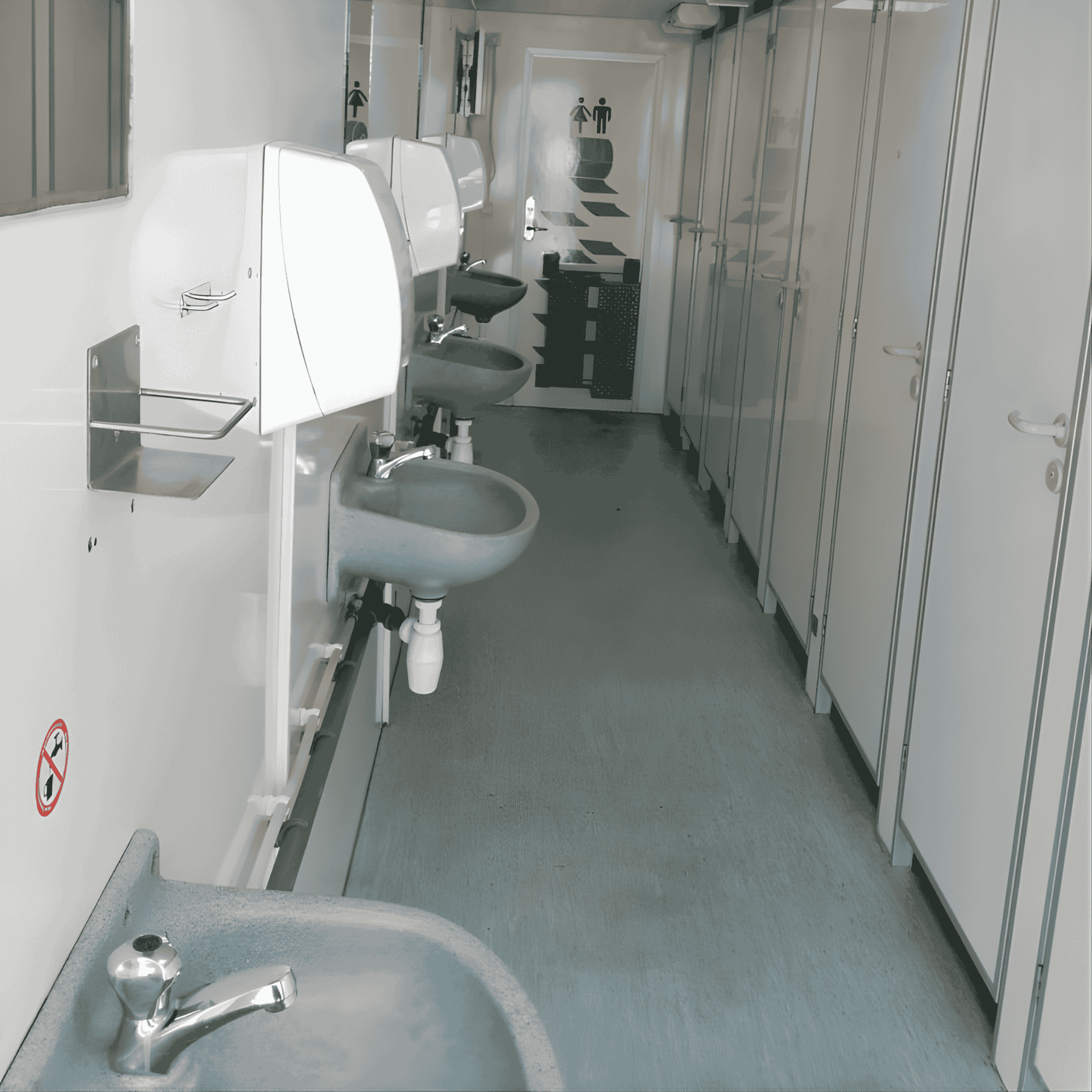 Toiletvogn med 10 separate WC’er - høj komfort og moderne design. Perfekt til events, hvor gæsteoplevelsen er i fokus. Inventar inkluderer håndvaske og håndtørrer samt spejle.
